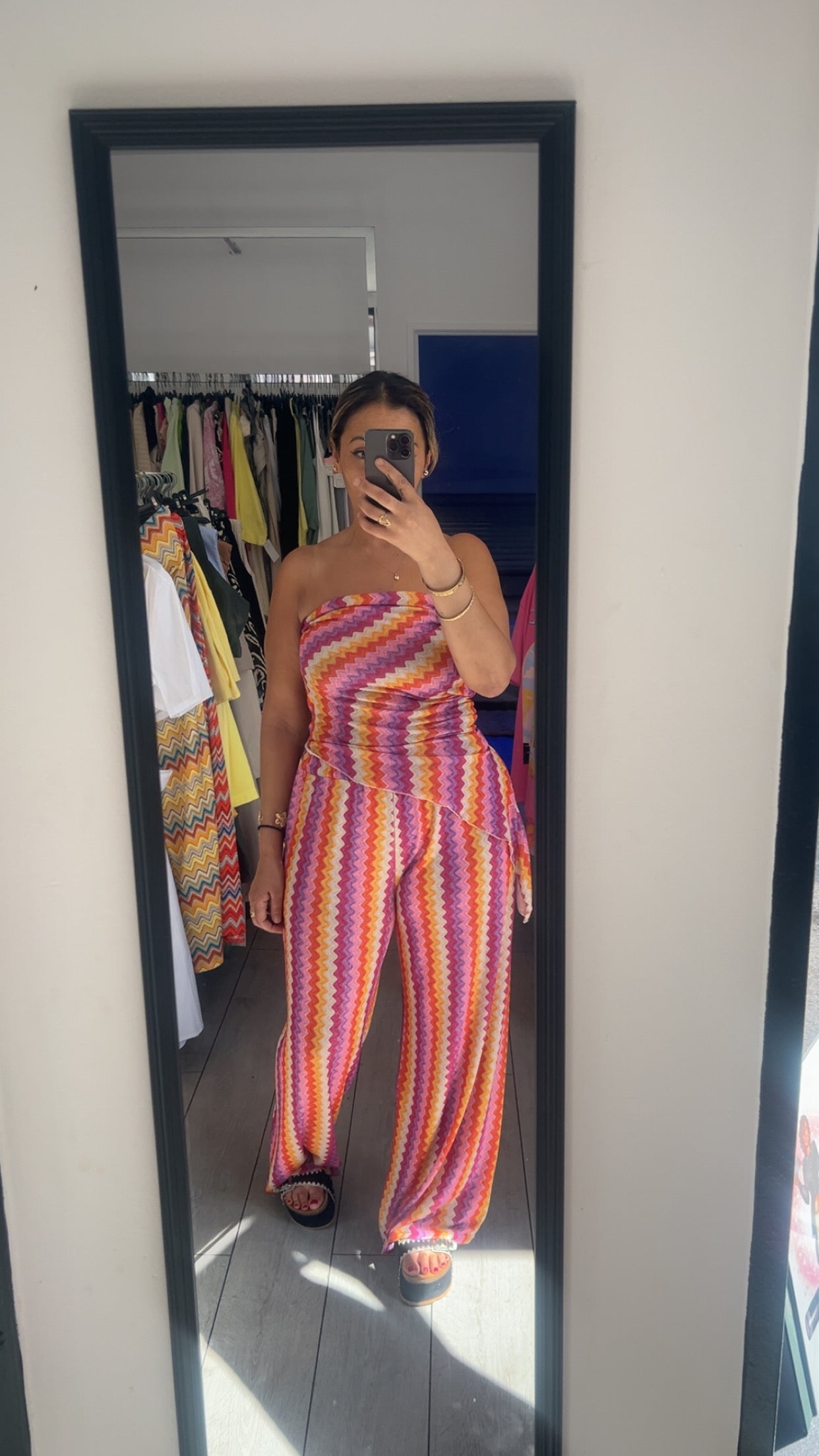 Adoptez un style éclatant cet été avec cet ensemble pantalon bustier coloré. La coupe large du pantalon assure confort et élégance tandis que le bustier souligne votre silhouette avec finesse. Parfait pour toutes les occasions estivales, il allie originalité et légèreté pour un look à la fois tendance et décontracté. Osez la couleur et laissez-vous séduire par ce duo indispensable de la saison.