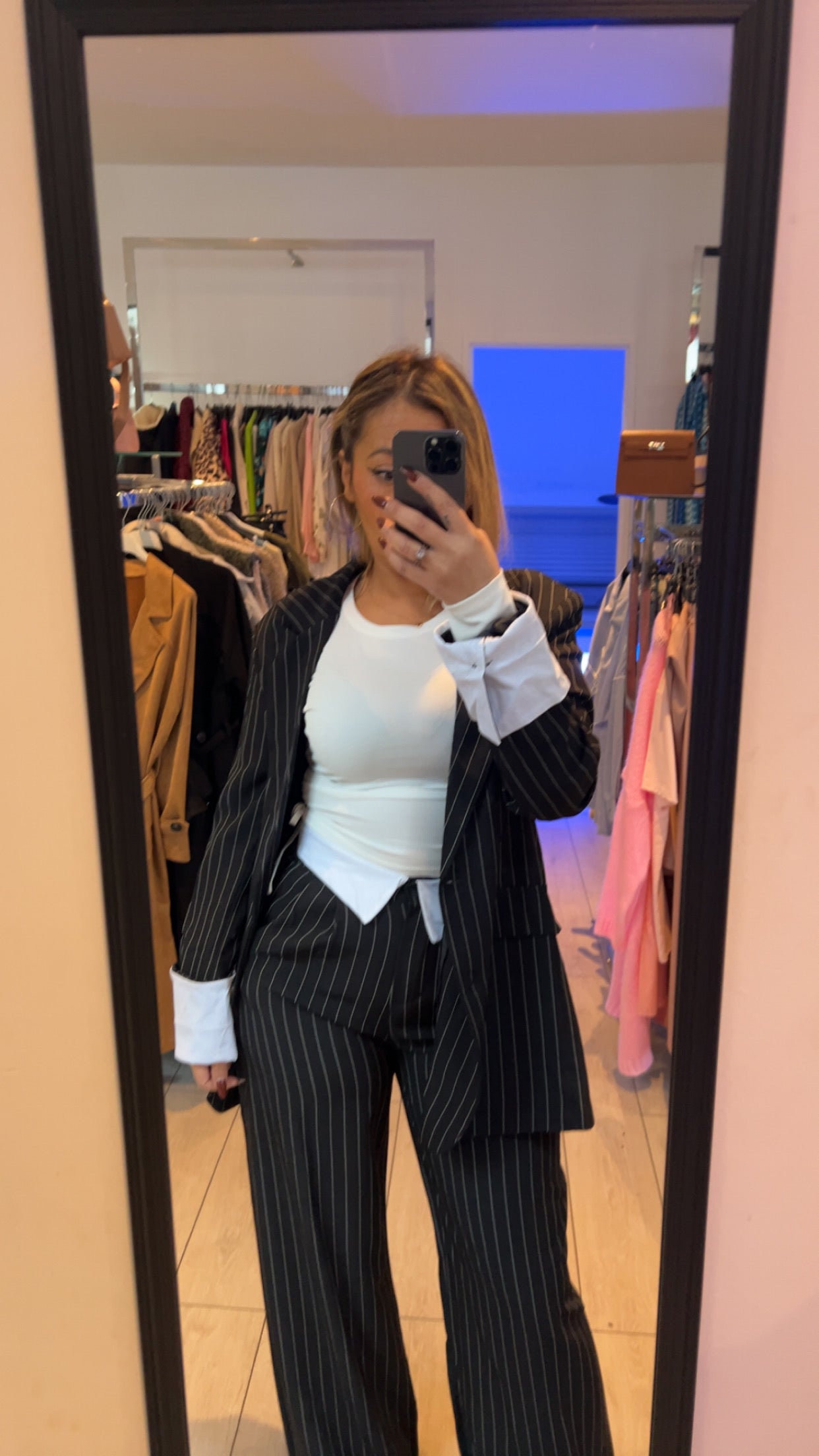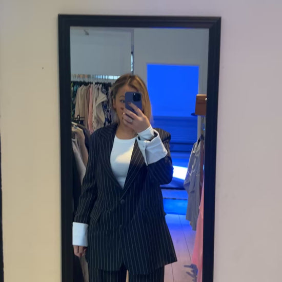 Cet ensemble deux pièces à rayures fines noir et blanc combine sophistication et modernité. La veste cintrée et le pantalon large créent une silhouette élégante et affirmée, idéale pour le bureau ou les occasions chic.