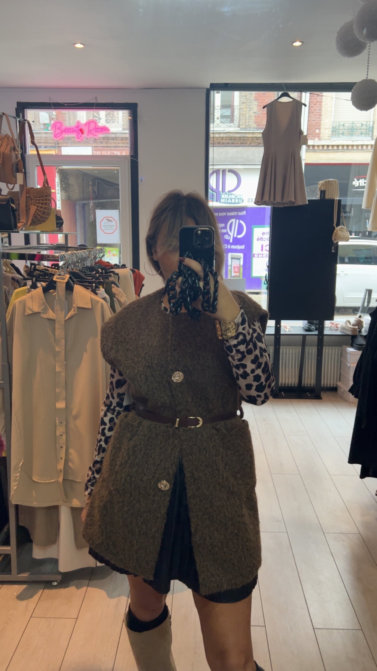 Découvrez cette magnifique veste mi-longue à manches courtes taille unique, déclinée dans un élégant coloris marron/beige, la pièce tendance et polyvalente qui apportera une touche d'élégance à votre garde-robe.